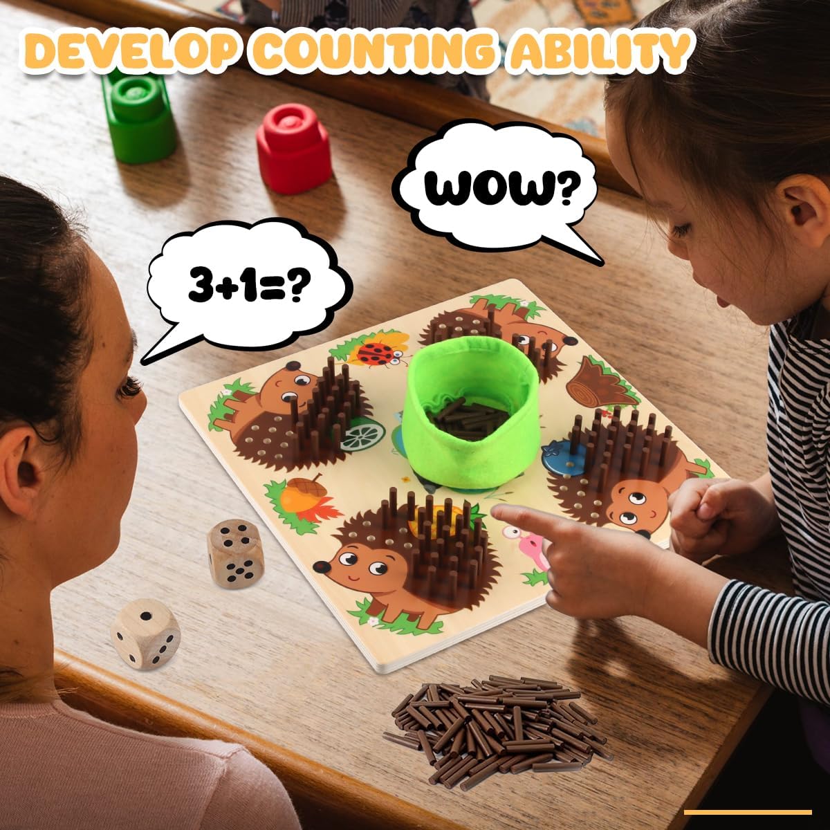 Gra HOGCOUNT w formie jeża jest wykonana z bezpiecznego, gładkiego i pozbawionego ostrych krawędzi drewna. Trwały materiał zapewnia długą żywotność, a 100 drewnianych patyczków wraz z 2 kostkami oferuje wiele różnych kombinacji liczbowych. To doskonałe narzędzie do nauki podstawowych operacji matematycznych. Oryginalny design jeża przyciąga uwagę dzieci i zwiększa zabawę podczas gry.